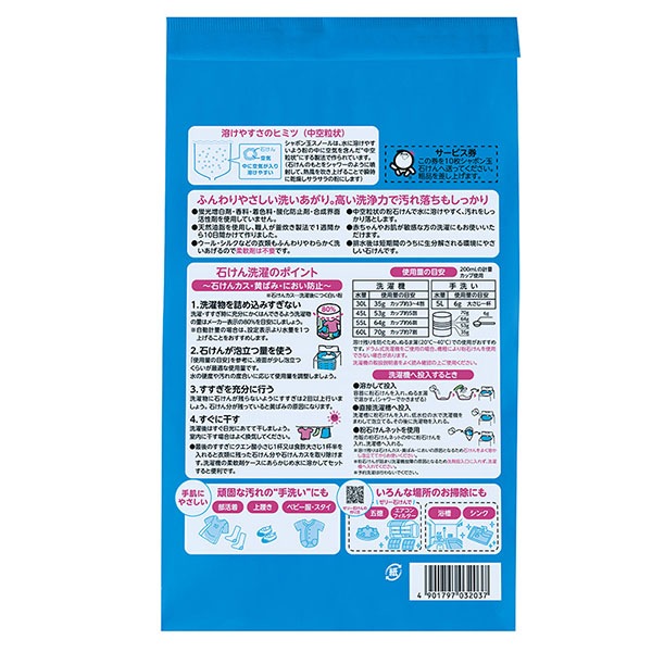 香料・蛍光増白剤・酸化防止剤・合成界面活性剤を使用していない、無添加の洗濯用粉石けんです。