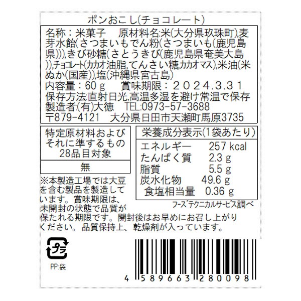 米(大分県玖珠産米)、麦芽水あめ(さつまいもでん粉(さつまいも(鹿児島県)))、きび砂糖(さとうきび(鹿児島県奄美大島産))、チョコレート(カカオ油脂・てんさい糖・カカオマス)、米油(米ぬか(国産))、塩(沖縄県宮古島)